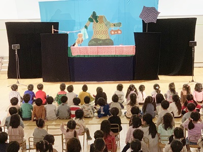 「うぬぼれネズミのチュウ」と「フクロウの染物屋」の2本立て。合間には、パネルシアターや歌遊びがあって、最後まで楽しませて頂きました。