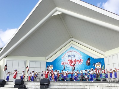 第67回とまこまい港まつりのステージイベントに、年長クラスが参加しました。揃いの衣装に身を包み、鼓笛を発表!