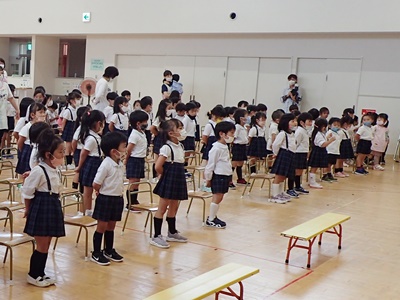 8月生まれさんの誕生会を行いました。園歌を歌って、8月生まれさんが登壇します。