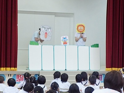 素敵な誕生カードをもらいます。そして、今月は先生たちの出し物、ペープサート「ネズミの嫁入り」を見ました。楽しいお話に、みんな釘付け。