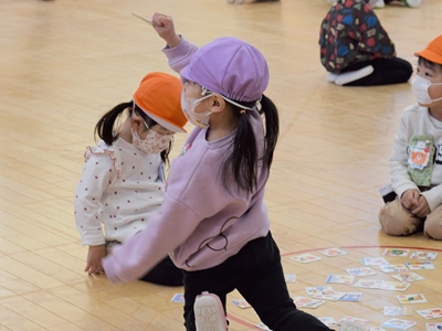 年少組は「おはなしかるた」、年中組は「ことわざかるた」、年長組は「日本一周かるた」をしました。
