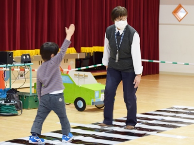 そして、横断歩道や信号機を使って、信号機がある所とない所の渡り方を実践しました。
