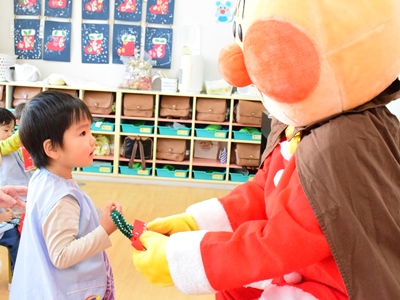 12月18日は、2歳・満3歳児組のお楽しみ会でした。アンパンマンサンタが登場し、みんなにプレゼントを配ってくれました。